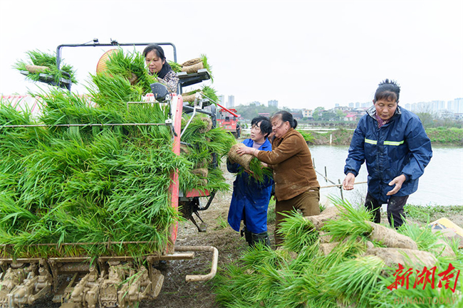 The photo, taken on March 30, shows farmers loading rice seedlings into a rice transplanter at Bali Village in Shanglingqiao Town, Yongzhou City. As temperatures gradually rise, farmers across the province are seizing the farming season to engage in spring farming, presenting a vibrant scene in the fields. (Photo/Lei Zhongxiang and Jiang Lingzhi)