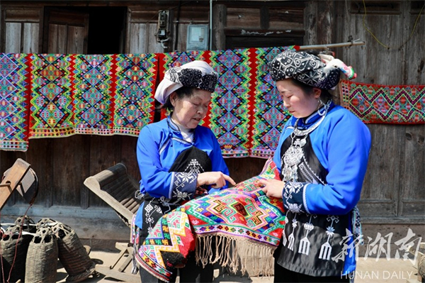 Miao brocade "Ba Pai" in the Miao language means patterned quilt cover, which is often called "ox-belly quilt cover". It is a traditional brocade of Miao ethnic minority. In recent years, Jishou City has made vigorous efforts to protect and inherit the intangible cultural heritages, tapping into their multiple values and revitalizing the traditional folk culture with their unique charm. The photo shows two inheritors of Xiangxi Miao brocade "Ba Pai" weaving skills discussing the brocade patterns at Yanzhu Village, Danqing Town, Jishou City. (Photo/Peng Jing)