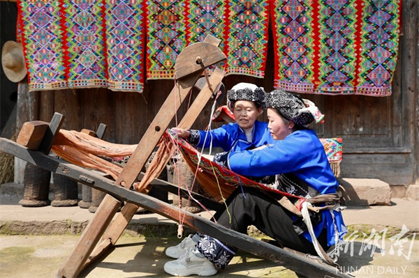 Miao brocade "Ba Pai" in the Miao language means patterned quilt cover, which is often called "ox-belly quilt cover". It is a traditional brocade of Miao ethnic minority. In recent years, Jishou City has made vigorous efforts to protect and inherit the intangible cultural heritages, tapping into their multiple values and revitalizing the traditional folk culture with their unique charm. The photo shows two inheritors of Xiangxi Miao brocade "Ba Pai" weaving skills weaving brocade at Yanzhu Village, Danqing Town, Jishou City. (Photo/Peng Jing)