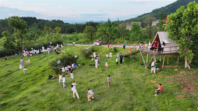 A drone photo taken on Aug. 23, 2025 shows children having fun at the lawn of the Dayuan Center for Community Arts and Culture in Dayuan Village of Ningyuan County, central China's Hunan Province. (Xinhua/Chen Zhenhai)
